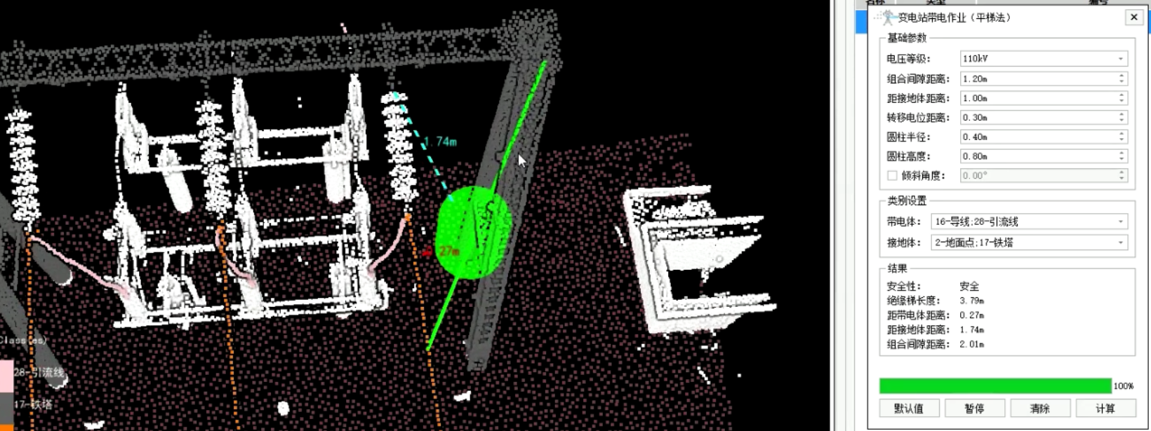 针对输电线路和变电站带电作业场景,提供多种作业方式,支持动态模拟作业人员进入等电位过程,计算距带电体和接地体距离、组合间隙距离及距相邻导线距离,并评估作业安全性。输电线路带电作业方式包括单点法、软梯法和路径法,变电站带电作业方式包括人字梯法、平梯法和升降平台法。